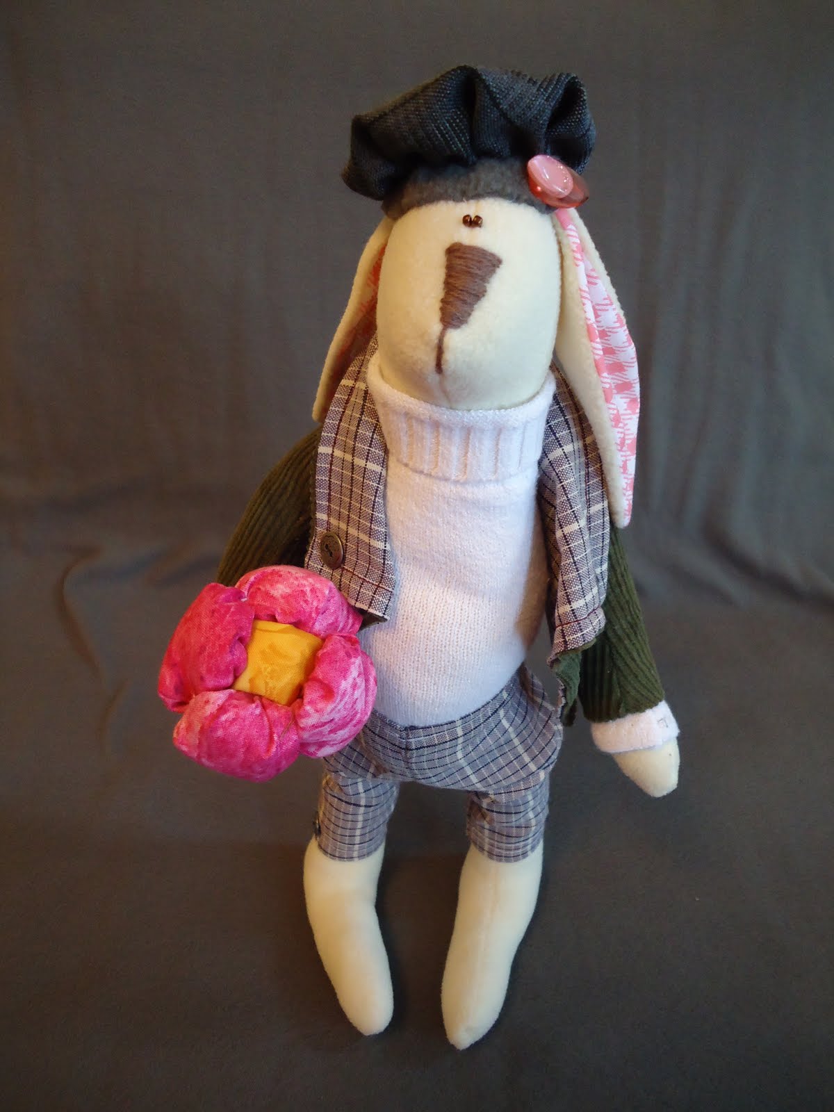 Вот и прошли очередные выходные дни...Кстати сказать,это были последние выходные этого лета...Жаль! Так не хочется чтобы оно заканчивалось! В выходные я схожу с ума:утром надо всех своих умыть,накормить,одеть(можно,конечно все это делать и в другом порядке...всегда получается по разному)))!) и только потом я могу умывать,одевать и кормить себя. К тому же по выходным бывают и неожиданные гости(иногда это нашествие злит,т.к.хотелось потратить это время на свои поделки,ну или тупо посмотреть телек),но все равно я смогла-таки навоять одного зайчика,точнее сказать зайчиху. Такая вся красивенькая да нарядненькая вышла...аж тащусь!